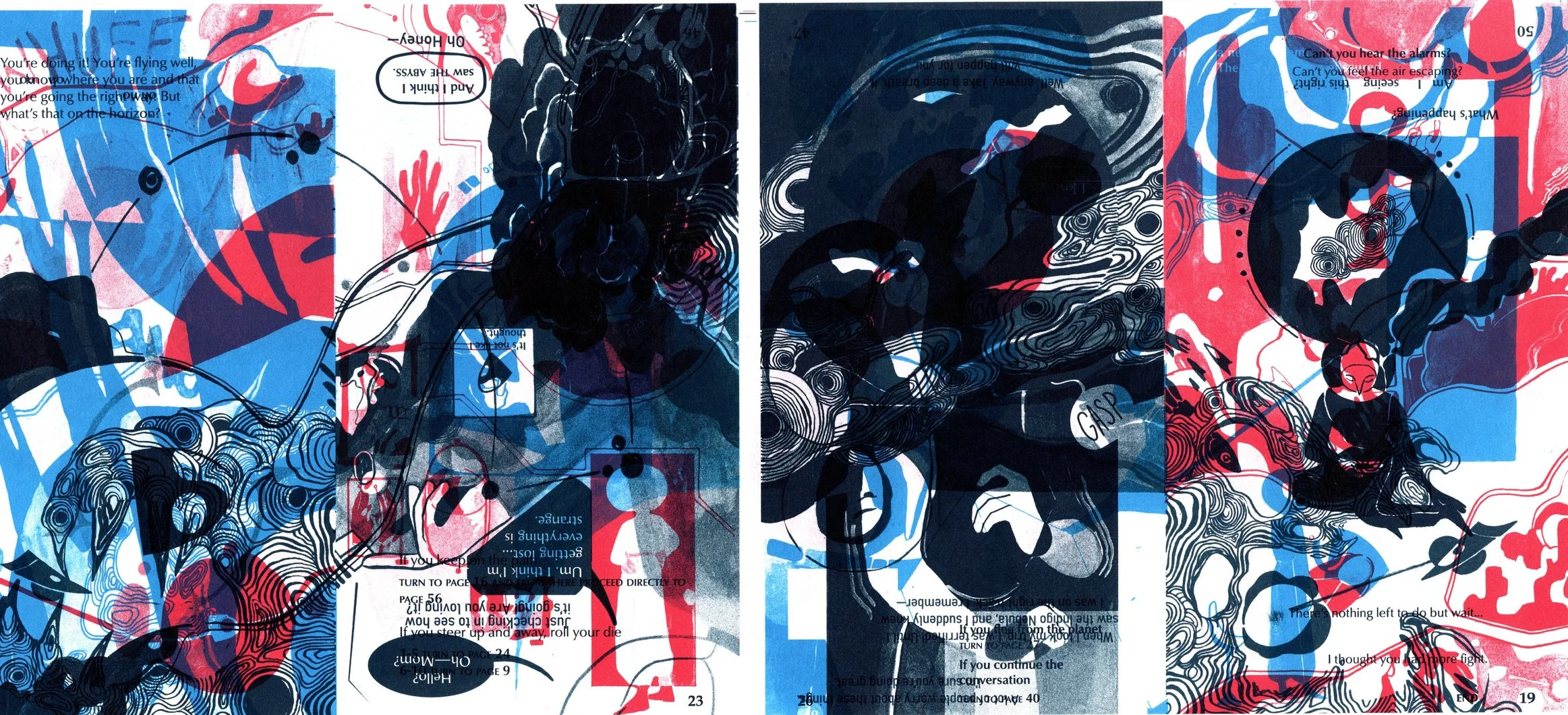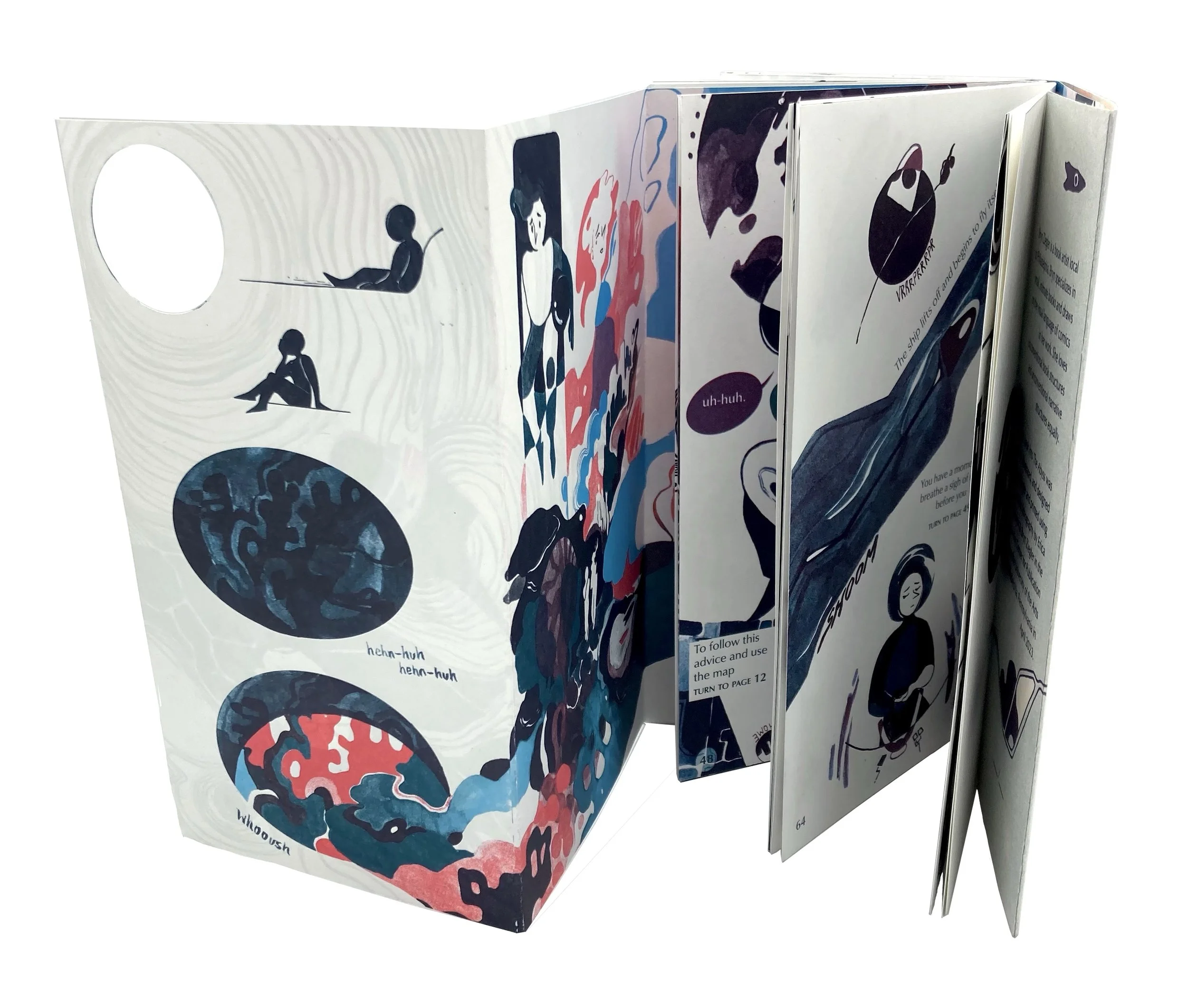 Don’t Look Into The Abyss is a choose-your-path comic printed by collaborative printer Erica Honson and myself in the Borowsky Center for Publication Arts in spring of 2023. The book edition size is 150, with a deluxe edition of 5. The production of this book was funded by the UArts DEIA Fellowship and the UArts School of Art Dean’s Office. Don’t Look Into The Abyss was short-listed for the 2024 Cartoonist Studio Prize in the short-form category! I am proud to have organized several companion events for this book at the Free Library of Philadelphia, including a curated exhibition of the Philadelphia Comix Collection, a free community bookbinding workshop, and a book launch— all of which you can see photos from in my News & Events tab!